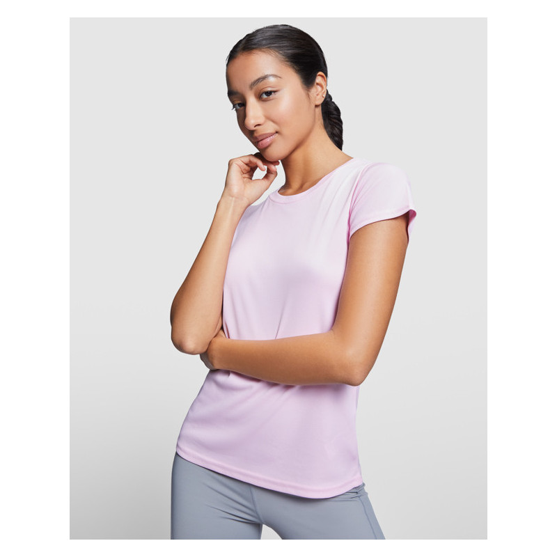 Camiseta técnica de manga corta para mujer, con cuello redondo. Combinado en espalda, hombros y mangas con dos tejidos de poliéster. Tejido principal frontal bird´s eye y tejido space dye en la parte trasera. Patronaje en la espalda ligeramente mas largo. Material: Tejido delantero: 100% poliéster bird´s eye. Tejido trasero: 100% poliéster space dye, 135 g/m². Modelo transpirable y de fácil secado.