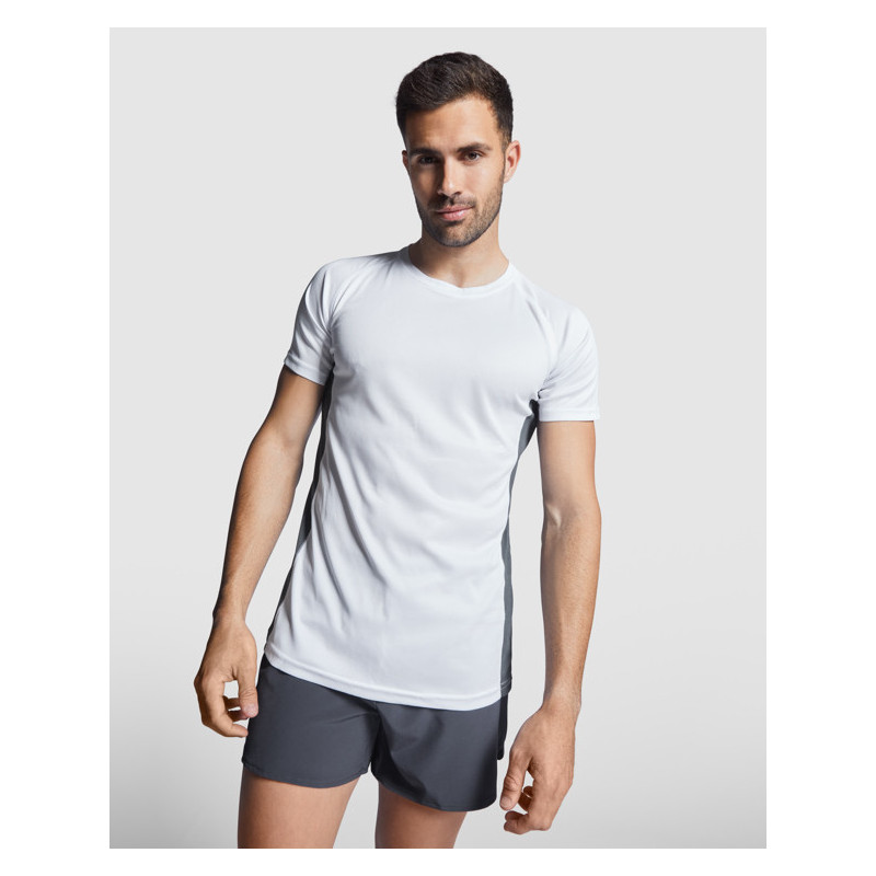 Camiseta técnica combinada con dos tejidos de poliéster, manga corta de estilo ranglán. Tejido principal bird's eye y paneles laterales e interior de la manga con tejido micro perforado. Cuello redondo con cubrecosturas de refuerzo en su interior. Camiseta de tejido confortable y fácilmente adaptable al cuerpo. Material: Tejido principal: 100% poliéster, bird's eye. Paneles: 100% poliéster microperforado. 140 g/m².