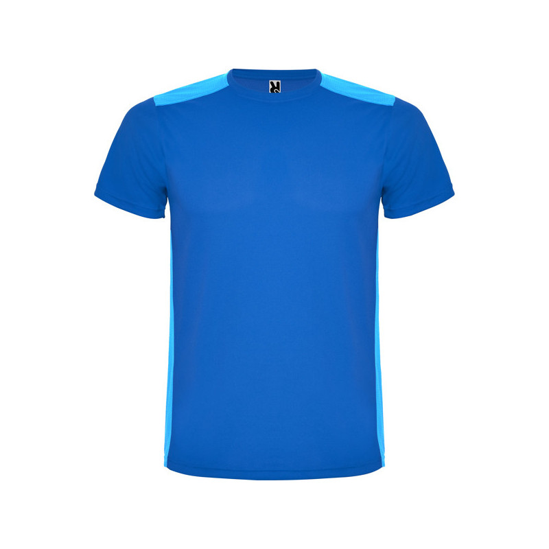 Conjunto deportivo unisex compuesto de 2 camisetas + 1 pantalón. ·Camisetas con manga semi raglán estampadas. ·Cuello redondo con tricot en la parte posterior. ·El color de la segunda camiseta se compone de manera contraria. ·Pantalón con cinturilla elástica con cordón interior a tono con pespunte de seguridad. ·Banda lateral a contraste y abertura lateral en el bajo del pantalón. Material: 100% poliéster, 140 g/m². Conjunto sin calcetas. *Etiqueta removible. *Tejido técnico. *Modelo transpirable.