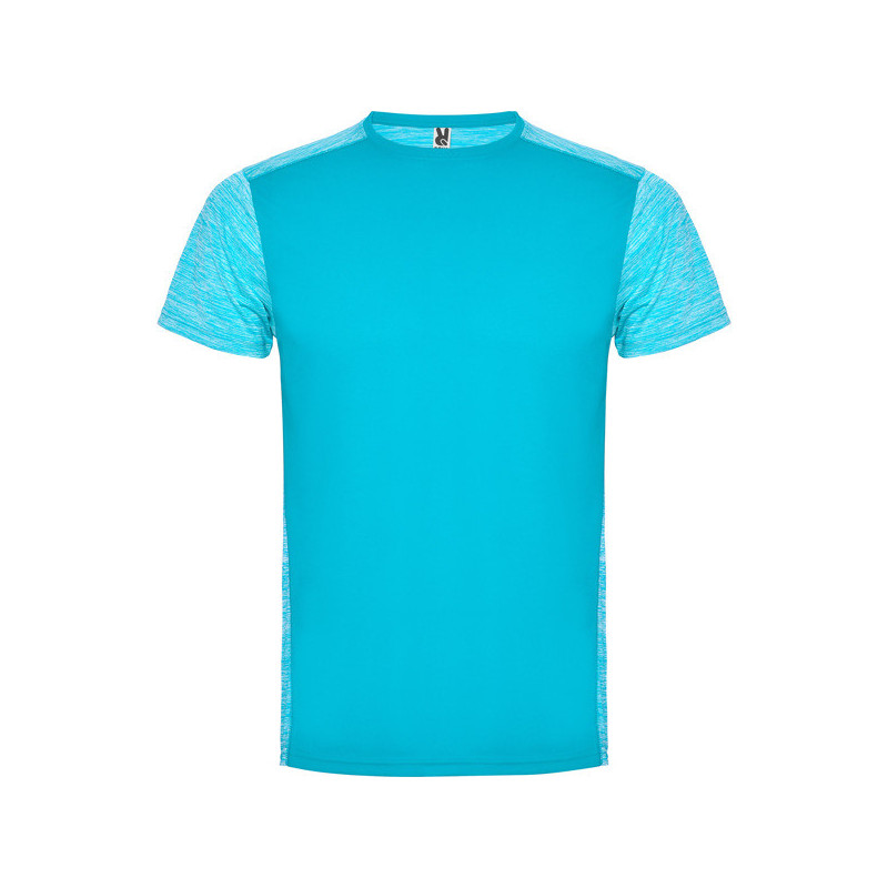 Camiseta técnica de manga corta con cuello redondo. Combinada en espalda, hombros y mangas con dos tejidos de poliéster. Tejido principal frontal bird´s eye y tejido space dye en la parte trasera. Patronaje en la espalda ligeramente mas largo. Material: Tejido delantero: 100% poliéster bird´s eye. Tejido trasero: 100% poliéster space dye. 135 g/m². Modelo transpirable de fácil secado.