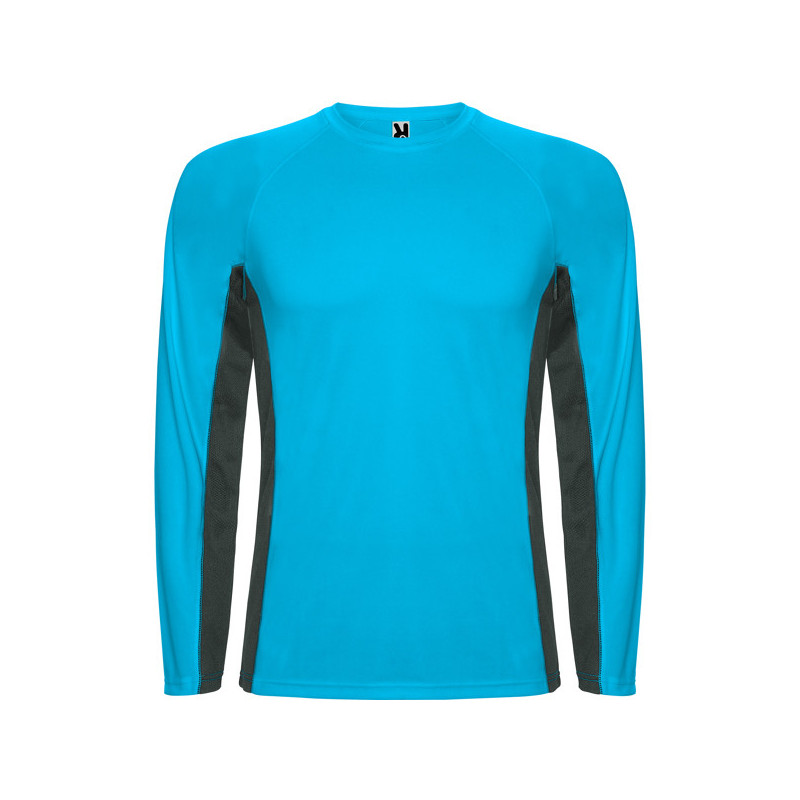 Camiseta técnica combinada, con dos tejidos de poliéster. Manga larga de estilo ranglán. Tejido principal bird´s eye y paneles laterales e interior de la manga con tejido micro perforado. Cuello redondo con cubrecosturas de refuerzo en su interior. Camiseta de tejido confortable y fácilmente adaptable al cuerpo. Material: Tejido principal: 100% poliéster bird´s eye. Paneles: 100% poliéster microperforado. 140 g/m².