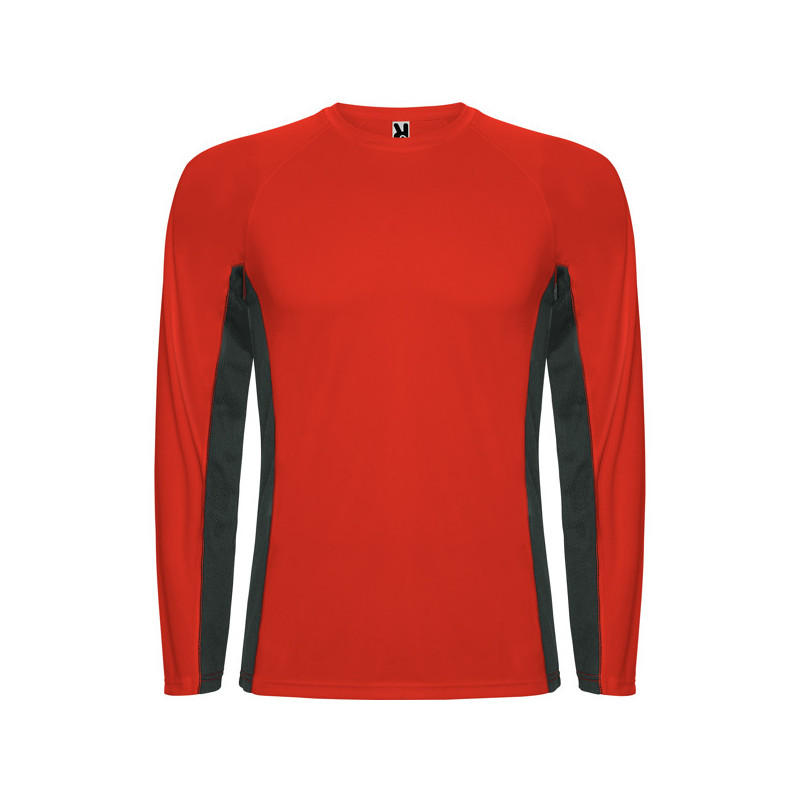 Camiseta técnica combinada, con dos tejidos de poliéster. Manga larga de estilo ranglán. Tejido principal bird´s eye y paneles laterales e interior de la manga con tejido micro perforado. Cuello redondo con cubrecosturas de refuerzo en su interior. Camiseta de tejido confortable y fácilmente adaptable al cuerpo. Material: Tejido principal: 100% poliéster bird´s eye. Paneles: 100% poliéster microperforado. 140 g/m².