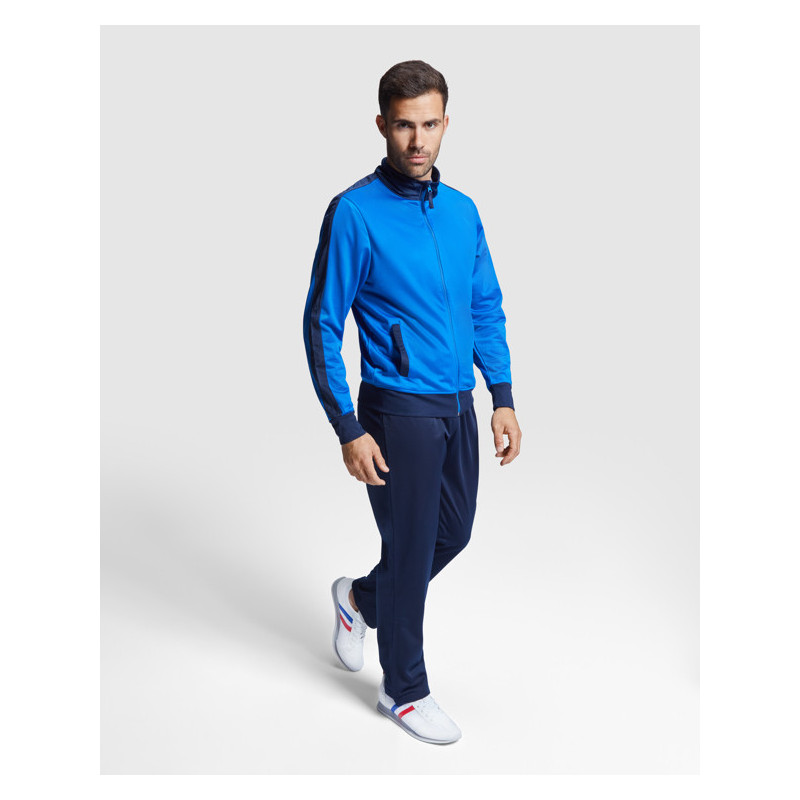 Chándal en tejido ligero y elástico. · Chaqueta con pecho a contraste de color y vivo. · Cuello alto con cubrecosturas a contraste. · Cremallera central · Bolsillos laterales. · Puños y cintura en canalé 2x2. · Pantalón con cintura elástica y cordón de ajuste. · Pieza lateral a contraste con vivo. · Bajo con cremallera. Material: 100% poliéster interlock, 225 g/m².