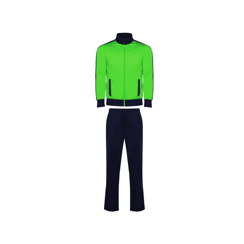 Chándal en tejido ligero y elástico. · Chaqueta con pecho a contraste de color y vivo. · Cuello alto con cubrecosturas a contraste. · Cremallera central · Bolsillos laterales. · Puños y cintura en canalé 2x2. · Pantalón con cintura elástica y cordón de ajuste. · Pieza lateral a contraste con vivo. · Bajo con cremallera. Material: 100% poliéster interlock, 225 g/m².