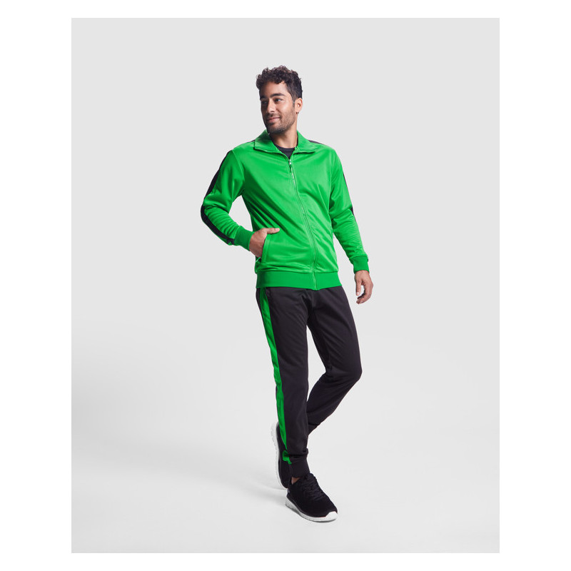 Chándal en tejido ligero y elástico. · Chaqueta con pecho a contraste de color y vivo. · Cuello alto con cubrecosturas a contraste. · Cremallera central · Bolsillos laterales. · Puños y cintura en canalé 2x2. · Pantalón con cintura elástica y cordón de ajuste. · Pieza lateral a contraste con vivo. · Bajo con cremallera. Material: 100% poliéster interlock, 225 g/m².