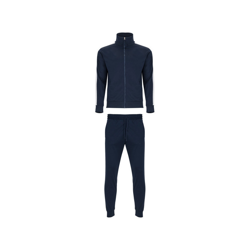 Chándal en tejido ligero y elástico. · Chaqueta con pecho a contraste de color y vivo. · Cuello alto con cubrecosturas a contraste. · Cremallera central · Bolsillos laterales. · Puños y cintura en canalé 2x2. · Pantalón con cintura elástica y cordón de ajuste. · Pieza lateral a contraste con vivo. · Bajo con cremallera. Material: 100% poliéster interlock, 225 g/m².