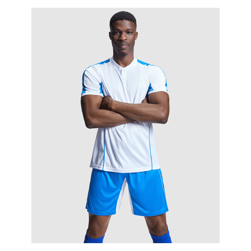 Conjunto deportivo unisex con combinación de tres tejidos: ·Camiseta con cuello mao y apertura mediante broche de presión. ·Interior de la manga en tejido transpirable. ·Paneles laterales y banda superior de manga en tejido control dry. ·Pantalón corto con cinturilla ajustable y cordones. ·Parte interior de la pierna y vivos a contraste en tejido control dry. Material: Tejido principal: 100% poliéster interlock. Paneles: 100% poliéster microperforado y 100% poliéster waffle interlock, 140 g/m².