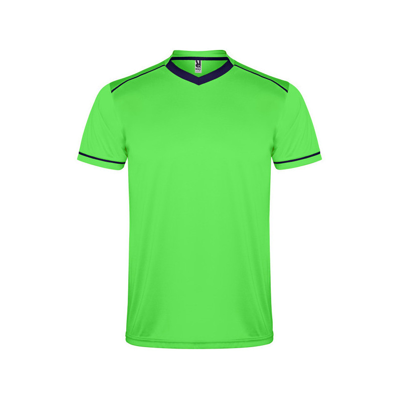 Conjunto deportivo de camiseta y pantalón. ·Camiseta con doble cuello de fantasía con acabado en pico con cubrecosturas reforzado en el interior. ·Hombro con adorno de ribete en contraste. ·Manga corta con apertura acabada en vivo y con ribete de adorno en contraste. ·Pantalón corto con cintura elástica con ajuste de cordón en su interior y pespunte de seguridad. Material: 100% poliéster, 140 g/m².