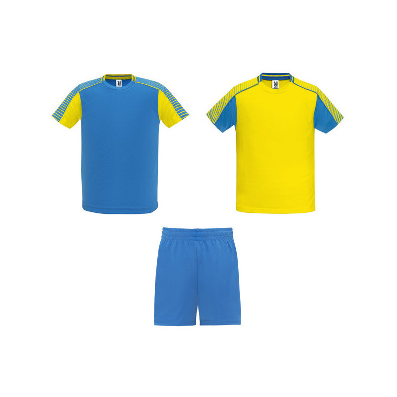 Conjunto deportivo unisex compuesto de 2 camisetas + 1 pantalón. ·Camisetas con manga semi raglán estampadas. ·Cuello redondo con tricot en la parte posterior. ·El color de la segunda camiseta se compone de manera contraria. ·Pantalón con cinturilla elástica con cordón interior a tono con pespunte de seguridad. ·Banda lateral a contraste y abertura lateral en el bajo del pantalón. Material: 100% poliéster, 140 g/m². Conjunto sin calcetas. *Etiqueta removible. *Tejido técnico. *Modelo transpirable.