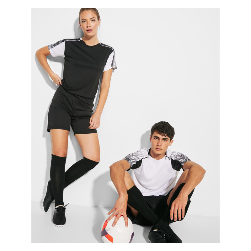 Conjunto deportivo unisex compuesto de 2 camisetas + 1 pantalón. ·Camisetas con manga semi raglán estampadas. ·Cuello redondo con tricot en la parte posterior. ·El color de la segunda camiseta se compone de manera contraria. ·Pantalón con cinturilla elástica con cordón interior a tono con pespunte de seguridad. ·Banda lateral a contraste y abertura lateral en el bajo del pantalón. Material: 100% poliéster, 140 g/m². Conjunto sin calcetas. *Etiqueta removible. *Tejido técnico. *Modelo transpirable.