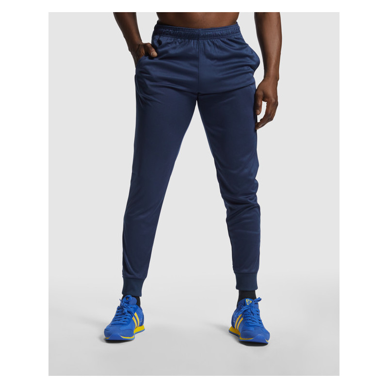 Pantalón largo de entrenamiento, con cinturilla elástica ajustable mediante cordones interiores. Bolsillos laterales. Bajos con puño y cremallera. Material: 100% poliéster interlock, 220 g/m².
