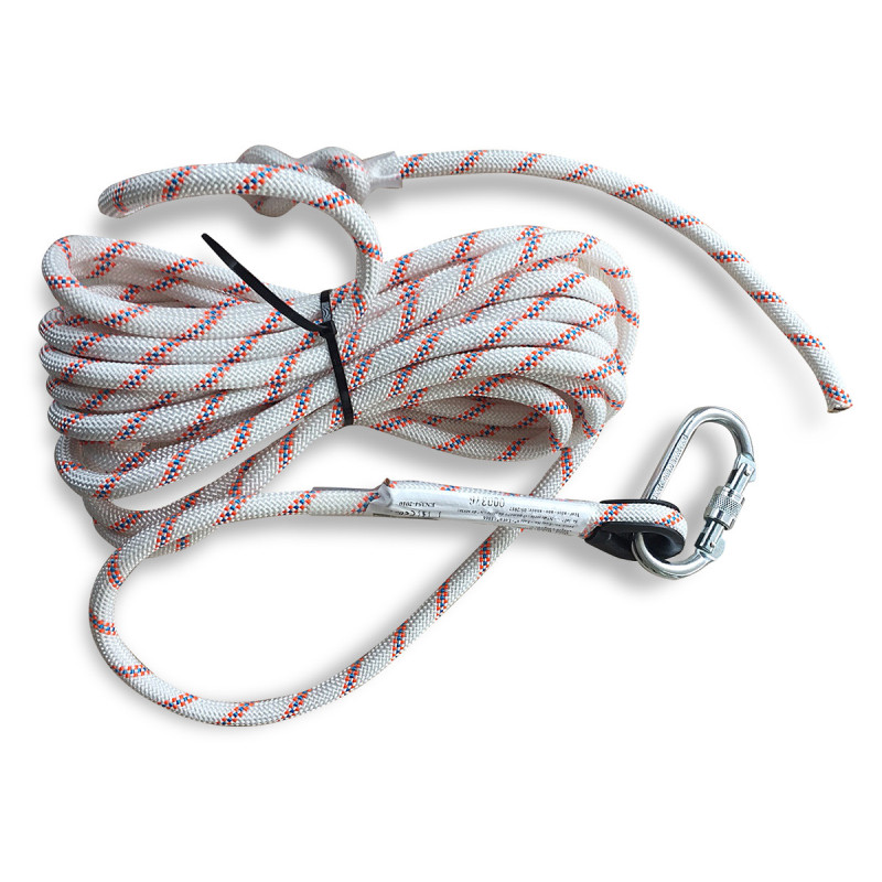 Características: Cuerdas de línea de vida verticales de 12mmØ de 20 metros, con mosquetón acero rosca y guardacabos. Cuerda tranzada de poliéster para ser usada con dispositivo WIND. Ref. 1888-DFA Resistencia mínima 22KN.