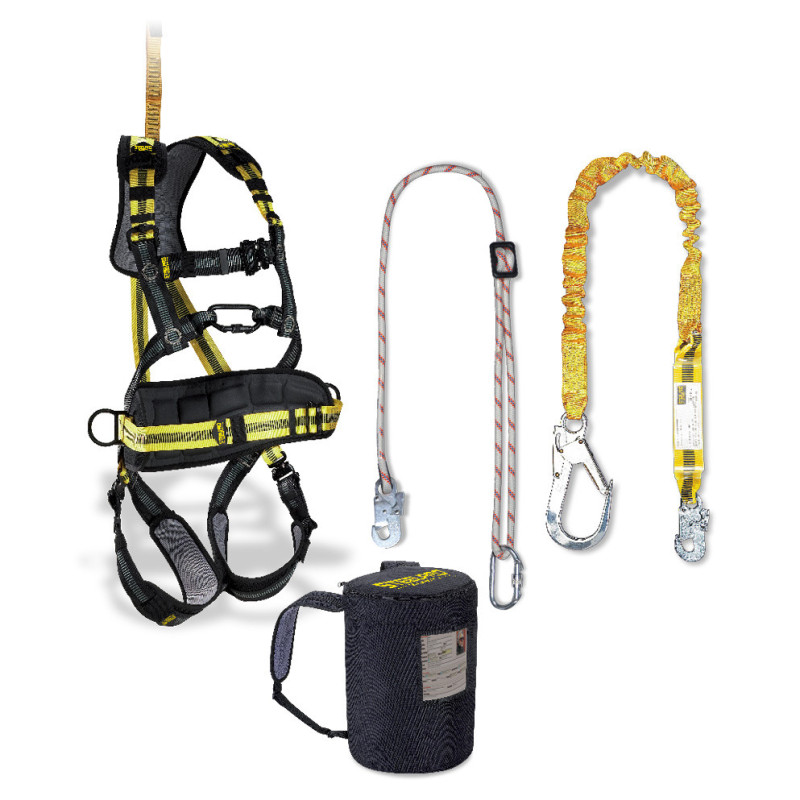 Arnés STEELSAFE-2 con enganche dorsal y frontal (1888ABF), dispositivo WIND anticaídas deslizante y de posicionamiento (1888DFA), cuerda de línea de vida 30 metros (1888C30) y mochila tejido Oxford (1888BAG).