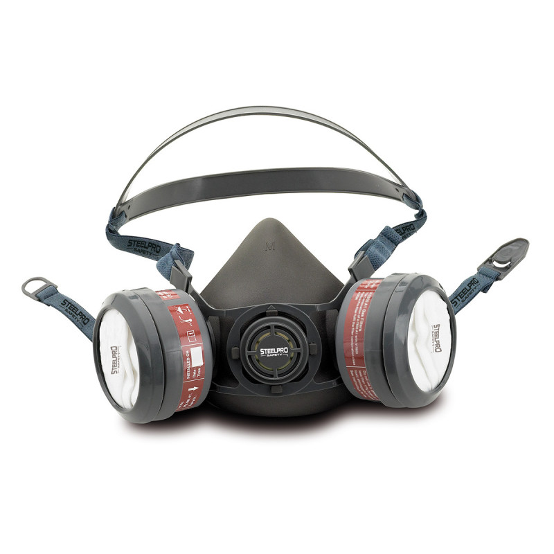 Características: Respirador media máscara fabricada en termoplástico hipoalergénico. Muy cómoda, suave y ligera (sólo 85gr). Diseño compacto, permite una excelente compatibilidad con otros equipos de protección (gafas, orejeras), y un excelente ajuste al rostro, brindando una cómoda e higiénica protección. Arnés para cabeza y cuello, muy cómodo y de fácil utilización. Diseño ergonómico, permite un perfecto equilibrio del peso de los filtros y un amplio campo de visión. Válvula de exhalación central con diseño anti-golpes. Sistema de conexión de rosca de los filtros facilita su montaje y desmontaje de los filtros reutilizables STEELPRO. Disponible en tres tamaños (S, M y L) para lograr un perfecto ajuste en distintos tamaños de rostros.