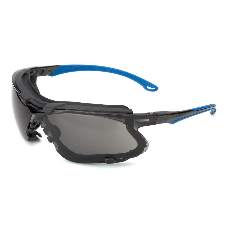 Gafa ocular tono gris (protección solar), lente de policarbonato, con tratamiento anti-rayadura y antiempañante, con amplio campo visual. Lente de protección contra radiación solar. Foam interior en EVA (material muy ligero y flexible, con gran capacidad para absorber impactos). Sella la gafa, impidiendo entrada de partículas. Mayor comodidad y confort. Absorción de posibles impactos, reduciendo la energía del golpe.