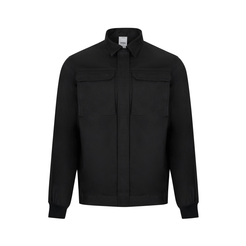 Cierre central asimétrico, con cremallera de doble cursor Manga raglán Cinturilla elástica Puños de canalé Doble costura de seguridad Cinco bolsillos: 1 bolsillo de parche en el pecho, con cremallera 2 bolsillos inferiores de parche 1 bolsillo trasero de parche 1 bolsillo para herramienta en pierna derecha COMPOSICIÓN SARGA. 65% POLIÉST 35% ALGODÓN 200 GSM