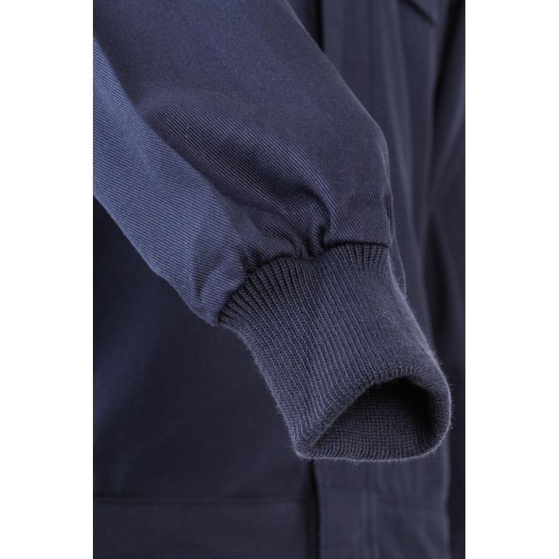 Cierre central asimétrico, con cremallera de doble cursor Manga raglán Cinturilla elástica Puños de canalé Doble costura de seguridad Cinco bolsillos: 1 bolsillo de parche en el pecho, con cremallera 2 bolsillos inferiores de parche 1 bolsillo trasero de parche 1 bolsillo para herramienta en pierna derecha COMPOSICIÓN SARGA. 65% POLIÉST 35% ALGODÓN 200 GSM
