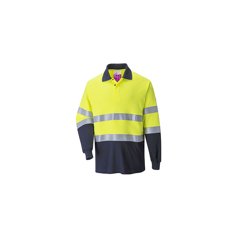Polo técnico de alta visibilidad en manga larga. · Cuello en punto canalé 1x1. · Tapeta con 3 botones a contraste. · Dos cintas reflectantes segmentadas en torso y mangas. · Tejido mezcla poliéster y algodón para mayor comodidad y transpirabilidad. · Bolsillo opcional.