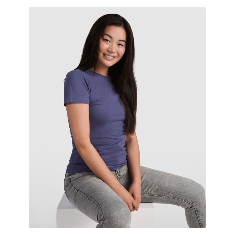 Camiseta de manga corta entallada. Cuello redondo de dos capas en canalé 1x1 con cubre costuras de hombro a hombro. Costuras laterales.