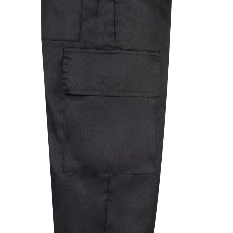 Cierre central con cremallera y botón Cinturilla elástica Costura trasera de seguridad Pinzas Cinco bolsillos: 2 bolsillos franceses 2 bolsillos de parche, con tapeta y velcro 1 bolsillo trasero de parche, con tapeta y velcro Composición SARGA. 80% POLIÉST 20% ALGODÓN 190 GSM