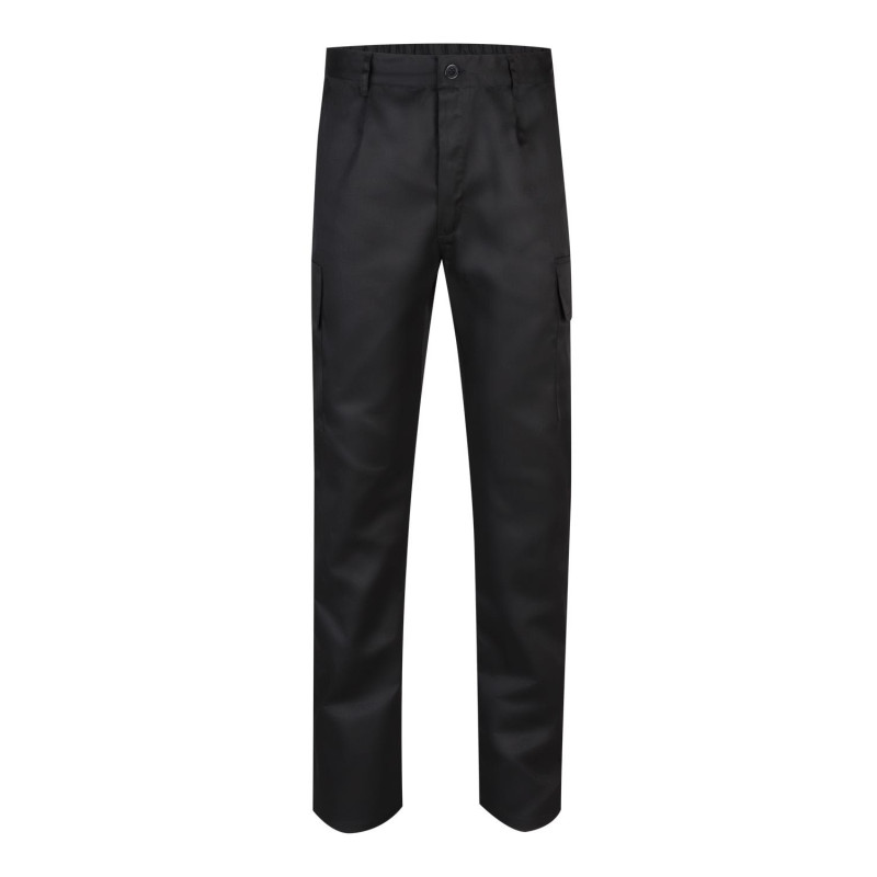 Cierre central con cremallera y botón Cintas reflectantes en el bajo de las piernas Cinturilla elástica Costura trasera de seguridad Pinzas Cinco bolsillos: 2 bolsillos franceses 2 bolsillos de parche, con tapeta y velcro 1 bolsillo trasero de parche, con tapeta y velcro Composición SARGA. 80% POLIÉST 20% ALGODÓN 190 GSM