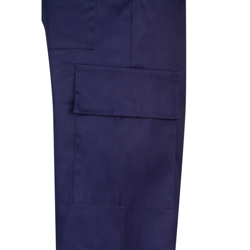 Cierre central con cremallera Hebillas de PVC Botones en los laterales de la cintura Cinturilla y tirantes elásticos Pinzas Doble costura de seguridad Seis bolsillos: 1 bolsillo de parche en el pecho, con cremallera. Sobre él, varios compartimentos 2 bolsillos inferiores de parche 1 bolsillo trasero de parche 2 bolsillos para herramienta en pierna derecha, uno encima del otro COMPOSICIÓN SARGA. 65% POLIÉST 35% ALGODÓN 200 GSM