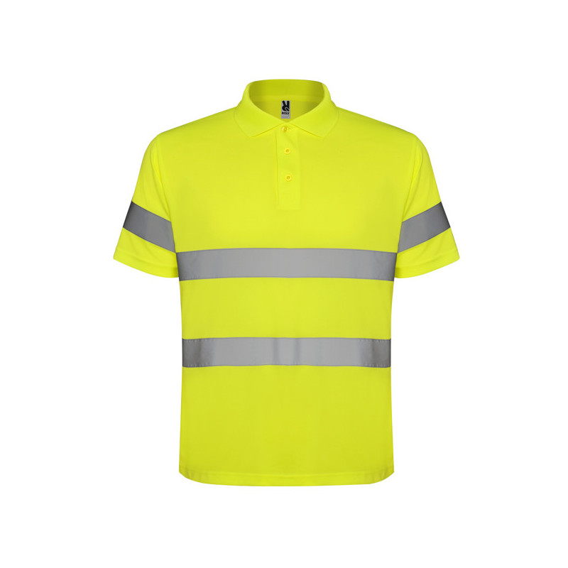 Polo técnico manga corta de alta visibilidad. · Cuello en punto canalé 1x1. · Tapeta con 3 botones. · Una cinta reflectante en mangas y dos en pecho y espalda. · Tejido anti enganches y fácil secado.