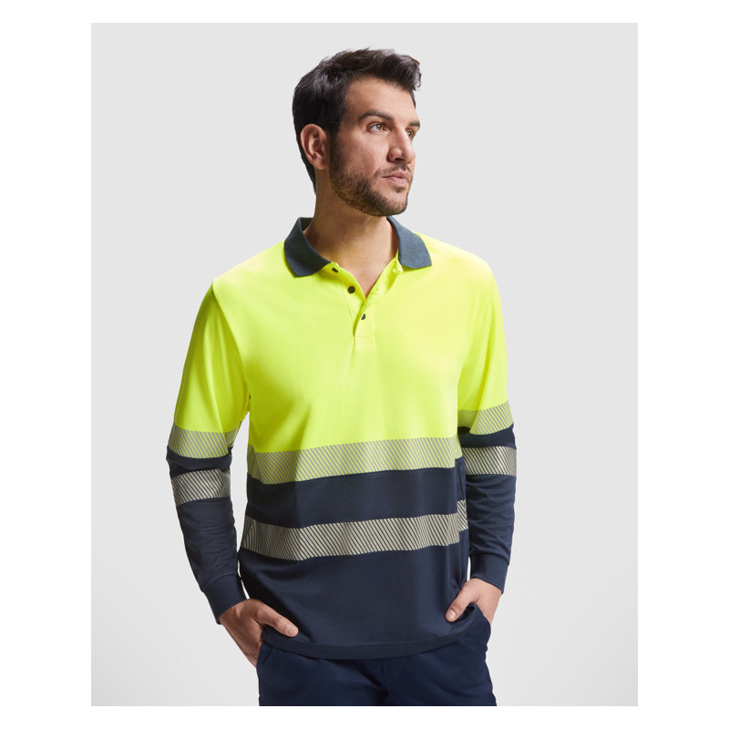 Polo técnico de alta visibilidad en manga larga. · Cuello y puño en punto canalé 1x1. · Dos cintas reflectantes segmentadas en torso y manga. · Tapeta con 3 botones a contraste. · Tejido anti enganches y fácil secado.