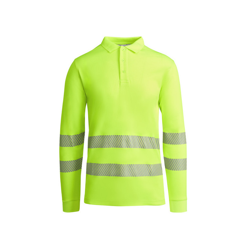 Polo técnico de alta visibilidad en manga larga. · Cuello en punto canalé 1x1. · Tapeta con 3 botones a contraste. · Dos cintas reflectantes segmentadas en torso y mangas. · Tejido mezcla poliéster y algodón para mayor comodidad y transpirabilidad. · Bolsillo opcional.