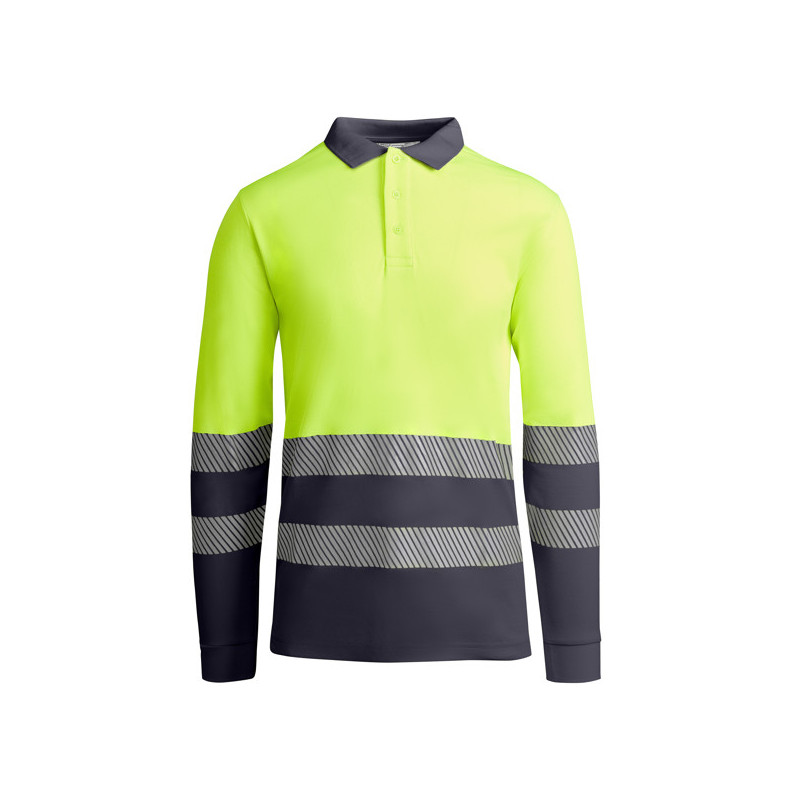 Polo técnico de alta visibilidad en manga larga. · Cuello en punto canalé 1x1. · Tapeta con 3 botones a contraste. · Dos cintas reflectantes segmentadas en torso y mangas. · Tejido mezcla poliéster y algodón para mayor comodidad y transpirabilidad. · Bolsillo opcional.