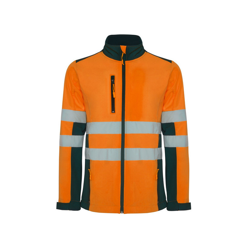 Softshell bicolor de alta visibilidad resistente al agua, tejido interior suave de alta capacidad térmica. · Cuello alto, cierre central con cremallera invertida. · Dos cintas reflectantes en torso y mangas. · Tres bolsillos exteriores. · Goma en el interior de la cintura con pulsador para ajustar. · Puños ajustables con velcro.