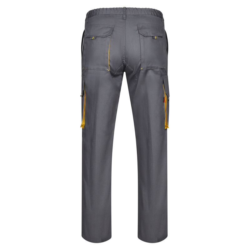 Cierre central con cremallera y botón Color de contraste en fuelles, tiradores y presillas Refuerzo de tejido trasero Cinturilla elástica Doble costura de seguridad Pinzas Seis bolsillos: 2 bolsillos franceses 2 bolsillos de fuelle, con fuelle central, tapeta, velcro y tiradores 2 bolsillos traseros de fuelle, con tapeta, velcro y tiradores Refuerzo Culera VELILLA Composición SARGA. 65% POLIÉST 35% ALGODÓN 200 GSM