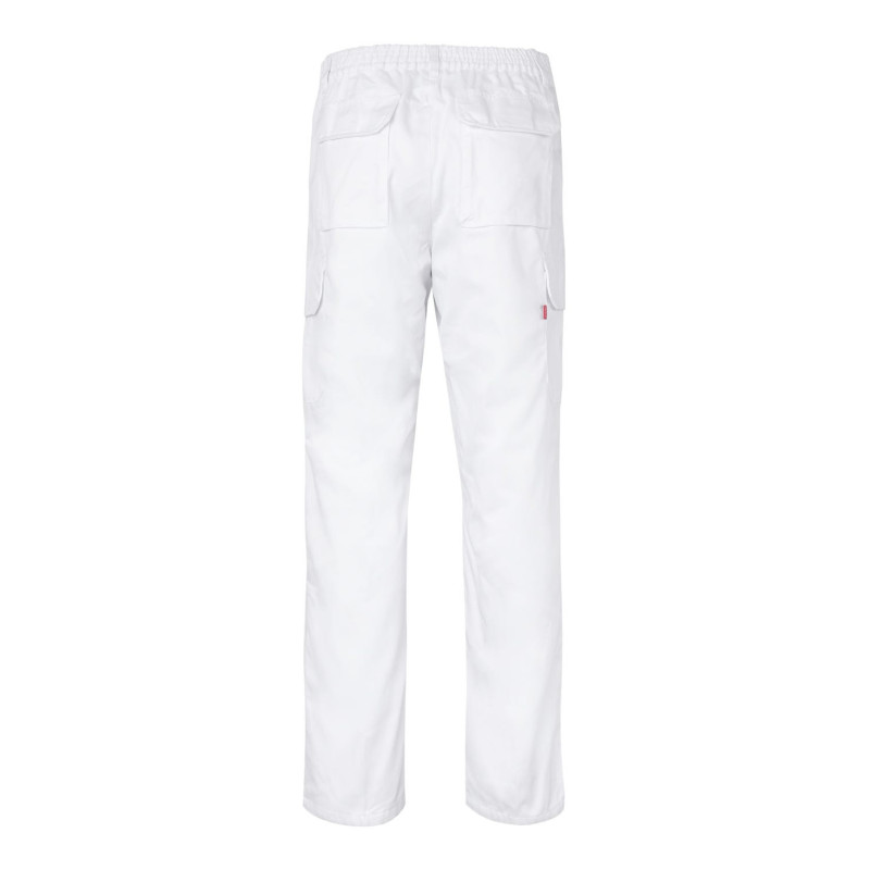 Cierre central con cremallera y botón Cintas reflectantes en el bajo de las piernas Cinturilla elástica Costura trasera de seguridad Pinzas Cinco bolsillos: 2 bolsillos franceses 2 bolsillos de parche, con tapeta y velcro 1 bolsillo trasero de parche, con tapeta y velcro Composición SARGA. 80% POLIÉST 20% ALGODÓN 190 GSM