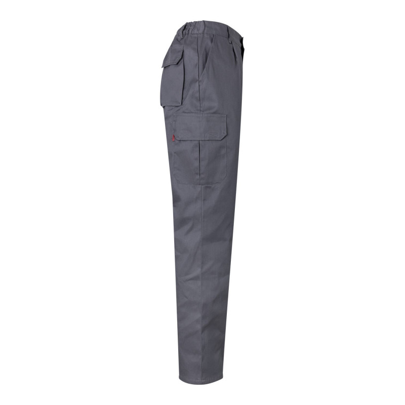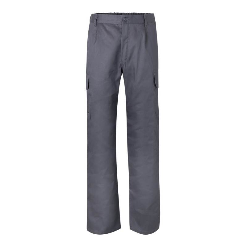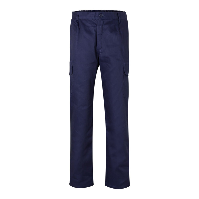 Cierre central con cremallera y botón Cintas reflectantes en el bajo de las piernas Cinturilla elástica Costura trasera de seguridad Pinzas Cinco bolsillos: 2 bolsillos franceses 2 bolsillos de parche, con tapeta y velcro 1 bolsillo trasero de parche, con tapeta y velcro Composición SARGA. 80% POLIÉST 20% ALGODÓN 190 GSM