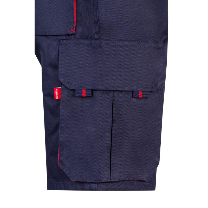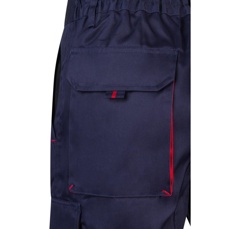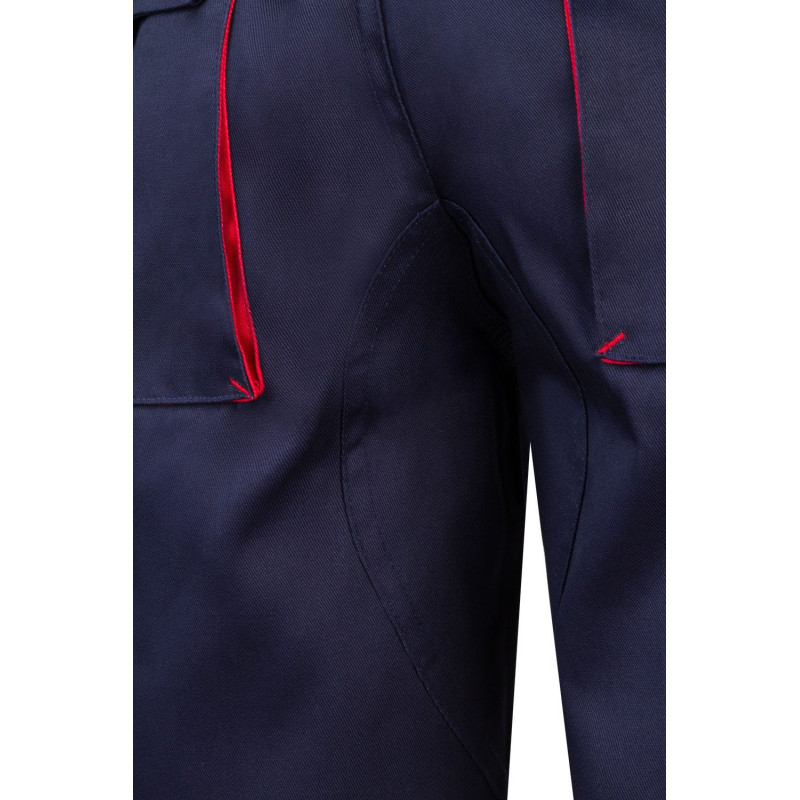 Cierre central con cremallera y botón Color de contraste en fuelles, tiradores y presillas Refuerzo de tejido trasero Cinturilla elástica Doble costura de seguridad Pinzas Seis bolsillos: 2 bolsillos franceses 2 bolsillos de fuelle, con fuelle central, tapeta, velcro y tiradores 2 bolsillos traseros de fuelle, con tapeta, velcro y tiradores Refuerzo Culera VELILLA Composición SARGA. 65% POLIÉST 35% ALGODÓN 200 GSM