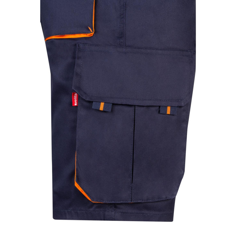 Cierre central con cremallera y botón Color de contraste en fuelles, tiradores y presillas Refuerzo de tejido trasero Cinturilla elástica Doble costura de seguridad Pinzas Seis bolsillos: 2 bolsillos franceses 2 bolsillos de fuelle, con fuelle central, tapeta, velcro y tiradores 2 bolsillos traseros de fuelle, con tapeta, velcro y tiradores Refuerzo Culera VELILLA Composición SARGA. 65% POLIÉST 35% ALGODÓN 200 GSM