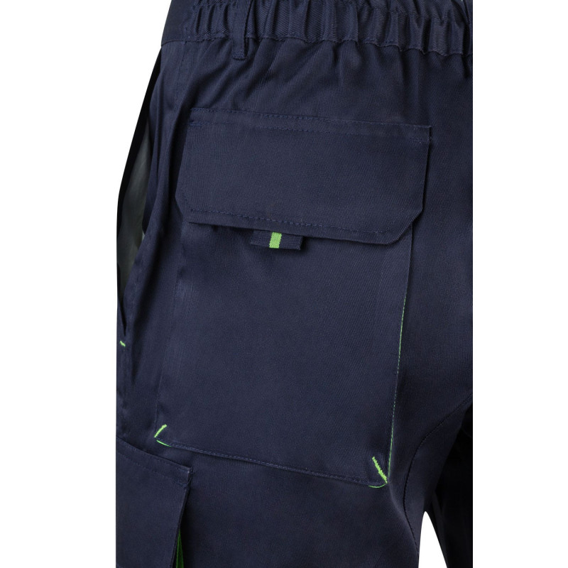 Pantalón largo laboral corte recto y tejido resistente. · Cinturilla ajustable elástica en parte trasera. · Dos bolsillos frontales. · Dos bolsillos funcionales traseros con solapa y cierre velcro. · Un bolsillo funcional lateral con solapa, cierre velcro y fuelle. · Bolsillo lateral derecho estrecho y sin solapa. · Refuerzo en entrepierna · Doble tejido en rodilleras.