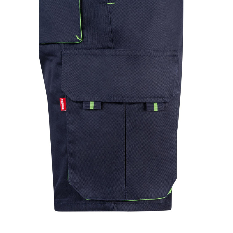 Pantalón largo laboral corte recto y tejido resistente. · Cinturilla ajustable elástica en parte trasera. · Dos bolsillos frontales. · Dos bolsillos funcionales traseros con solapa y cierre velcro. · Un bolsillo funcional lateral con solapa, cierre velcro y fuelle. · Bolsillo lateral derecho estrecho y sin solapa. · Refuerzo en entrepierna · Doble tejido en rodilleras.