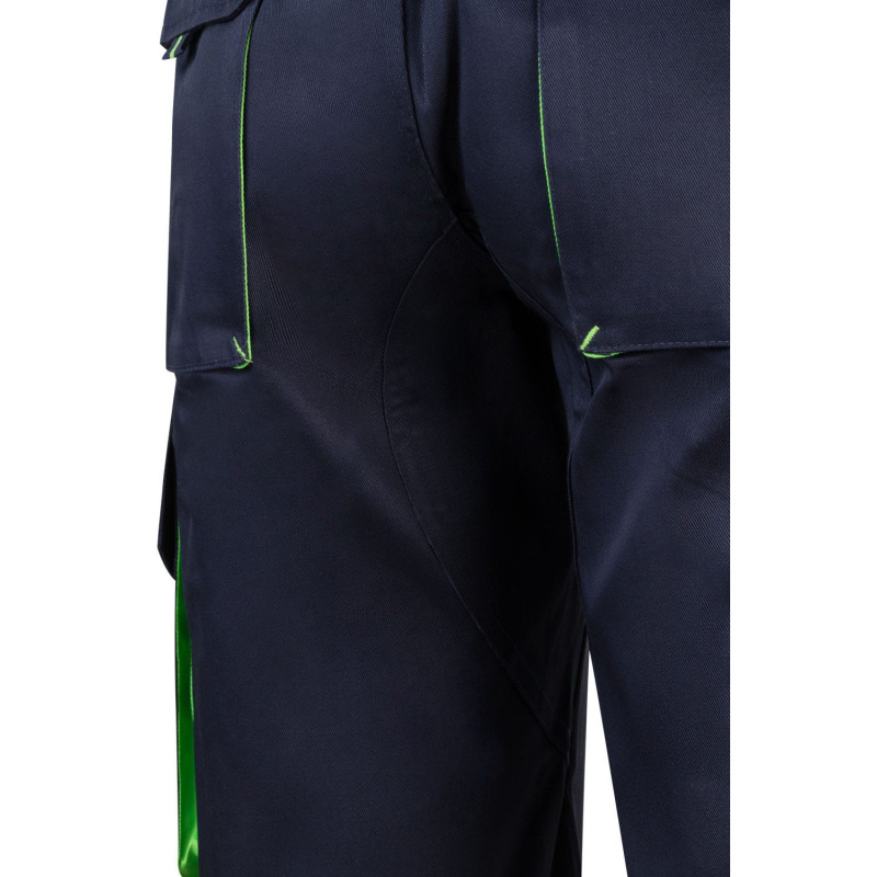 Cierre central con cremallera y botón Cintas reflectantes en el bajo de las piernas Color de contraste en fuelles, tiradores, presillas y tejido entre bandas Cinturilla elástica Doble costura de seguridad Seis bolsillos: 2 bolsillos franceses 2 bolsillos de fuelle, con doble fuelle central, tapeta, velcro y tiradores 2 bolsillos traseros de fuelle con tapeta, velcro y tiradores Sarga: 100% algodón / 240 gr/m2 Tejido flúor (amarillo): 80% poliéster - 20% algodón / 210 gr/m2 Tejido flúor (naranja): 60% algodón - 40% poliéster / 240 gr/m2 Composición SARGA. TEJIDO BASE: 100% ALGOD 240 GSM
