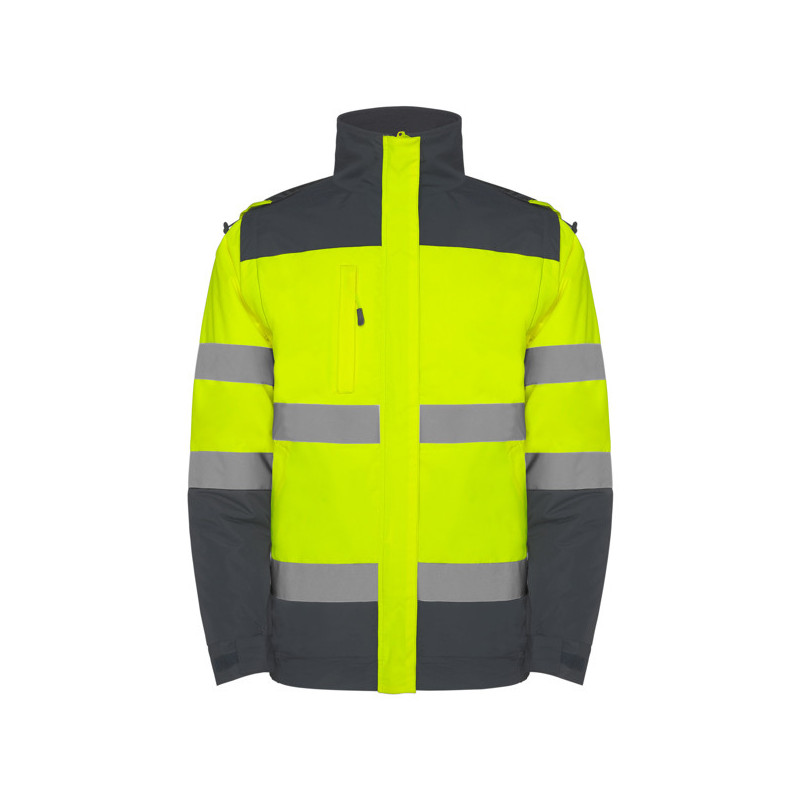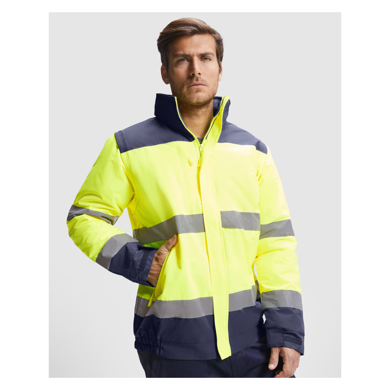 Parka acolchada de alta visibilidad combinada en dos colores. · Capucha enrollable con cordón ajustable y ribete flúor. · Bolsillo en la zona del pecho con cremallera. · Dos cintas reflectantes en el cuerpo y las mangas. · Mangas desmontables. · Dos bolsillos frontales ligeramente inclinados de fácil acceso. · Puños ajustables por zona elástica y por cierres en velcro. · Tapeta central con cierre de velcro y cremallera central flúor con tirador. · Acceso interior para serigrafía. · Bajo con zona elástica. Material: Exterior: 100% waterproof poliéster. Forro: 100% poliéster. Guata: 100% poliéster. 400 g/m². *Alta visibilidad. *Modelo resistente al agua. *Modelo a prueba de viento. Certificación CE según las normas: EN ISO 13688:2013/A1:2021 EN ISO 20471:2013/A1:2017. Clase II.