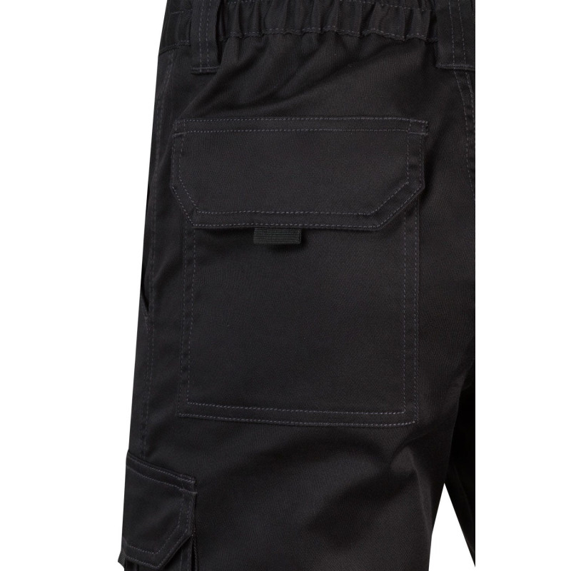 Cierre central con cremallera y botón Costuras con hilo de contraste Cinturilla elástica Doble costura de seguridad Seis bolsillos: 2 bolsillos franceses 2 bolsillos de fuelle, con doble fuelle central, tapeta, velcro y tiradores 2 bolsillos traseros de parche, con tapeta y velcro Composición STRETCH. 46% ALGODÓN - 38% EME 240 GSM