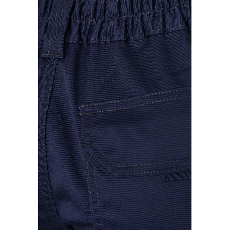Cierre central con cremallera y botón Costuras con hilo de contraste Cinturilla elástica Doble costura de seguridad Seis bolsillos: 2 bolsillos franceses 2 bolsillos de fuelle, con doble fuelle central, tapeta, velcro y tiradores 2 bolsillos traseros de parche, con tapeta y velcro Composición STRETCH. 46% ALGODÓN - 38% EME 240 GSM