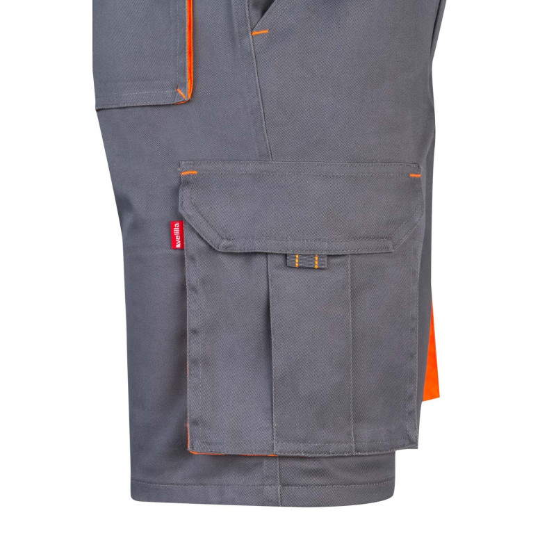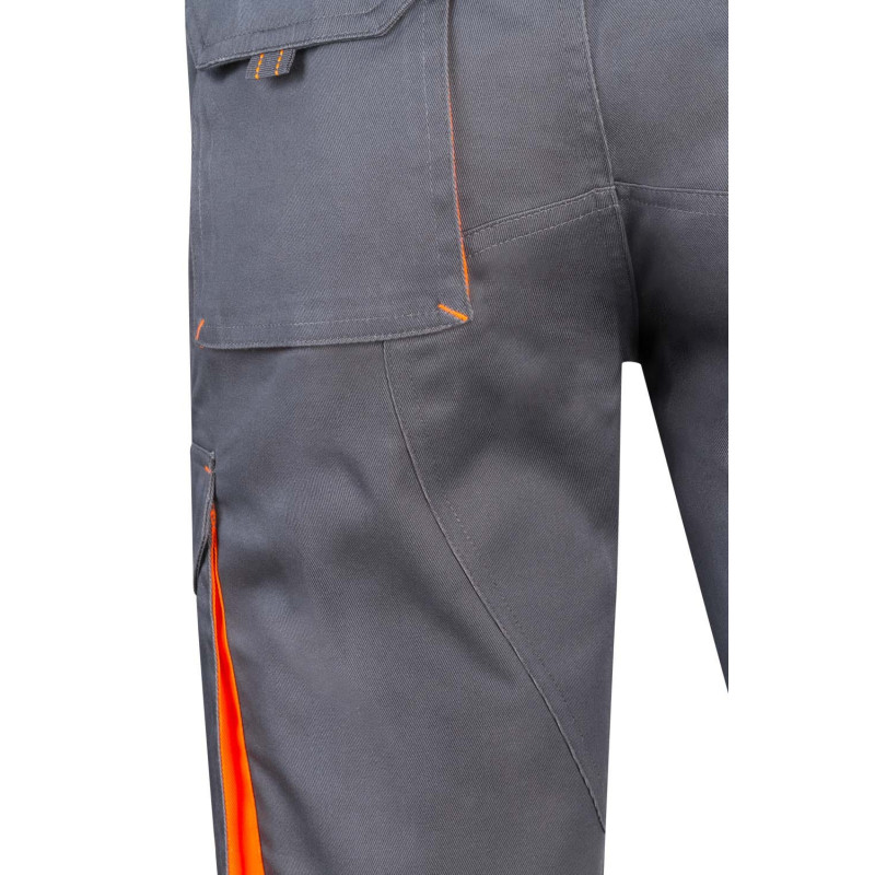 Cierre central con cremallera y botón Color de contraste en fuelles, tiradores y presillas Refuerzo de tejido trasero Cinturilla elástica Doble costura de seguridad Seis bolsillos: 2 bolsillos franceses 2 bolsillos de fuelle, con doble fuelle central, tapeta, velcro y tiradores 2 bolsillos traseros de fuelle, con tapeta, velcro y tiradores Refuerzo Culera VELILLA Composición 0 GSM