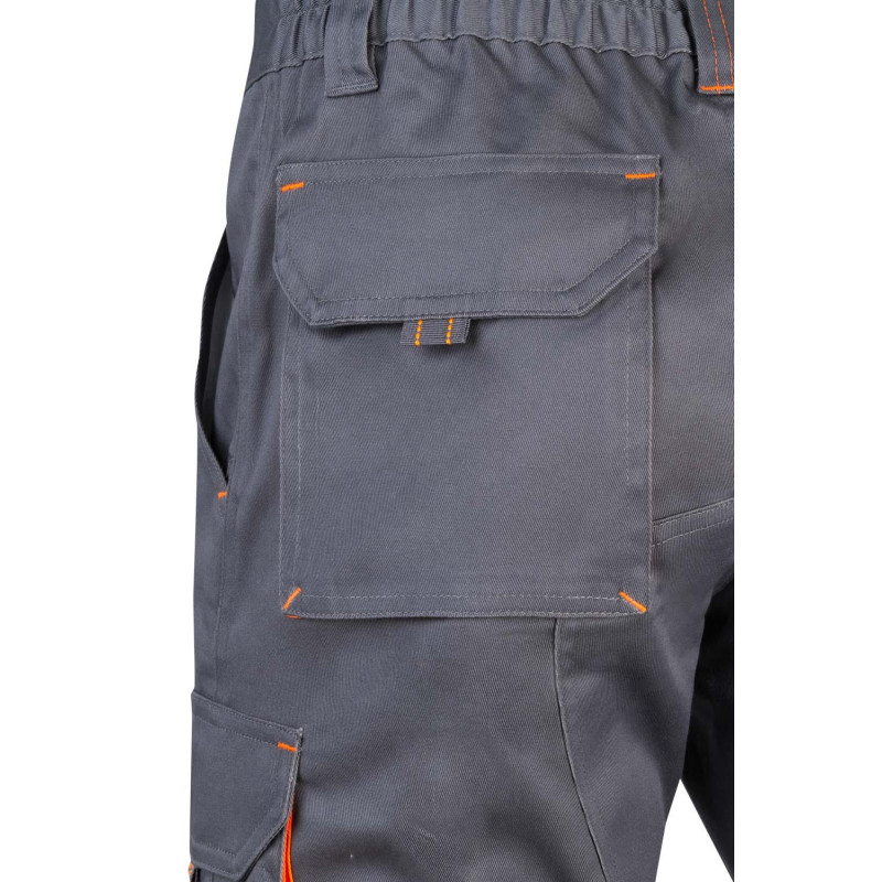 Pantalón largo laboral corte recto y tejido resistente. · Cintura ajustable elástica en parte trasera. · Dos bolsillos frontales. · Bolsillo funcional trasero con solapa y cierre velcro. · Dos bolsillos funcionales laterales con solapa y cierre velcro. · Refuerzo en entrepierna. · Doble tejido en rodilleras.