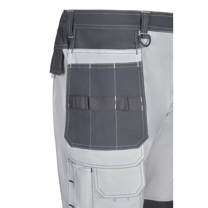 Corte slim fit Cierre central con cremallera y botón Costuras con hilo de contraste Cinturilla elástica Doble costura de seguridad Seis bolsillos: 2 bolsillos franceses 2 bolsillos de fuelle con doble fuelle central, tapeta, velcro y tiradores 2 bolsillos traseros de parche, con tapeta, velcro y tiradores Composición STRETCH. 46% ALGODÓN - 38% EME 240 GSM