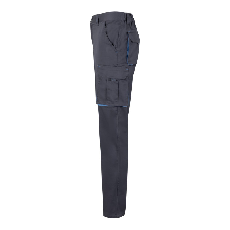 Pantalón largo laboral corte recto y tejido resistente. · Cintura ajustable elástica en parte trasera. · Dos bolsillos frontales. · Bolsillo funcional trasero con solapa y cierre velcro. · Dos bolsillos funcionales laterales con solapa y cierre velcro. · Refuerzo en entrepierna. · Doble tejido en rodilleras.
