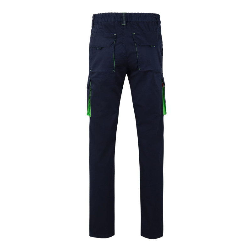 Pantalón largo laboral corte recto y tejido resistente. · Cintura ajustable elástica en parte trasera. · Dos bolsillos frontales. · Bolsillo funcional trasero con solapa y cierre velcro. · Dos bolsillos funcionales laterales con solapa y cierre velcro. · Refuerzo en entrepierna. · Doble tejido en rodilleras.