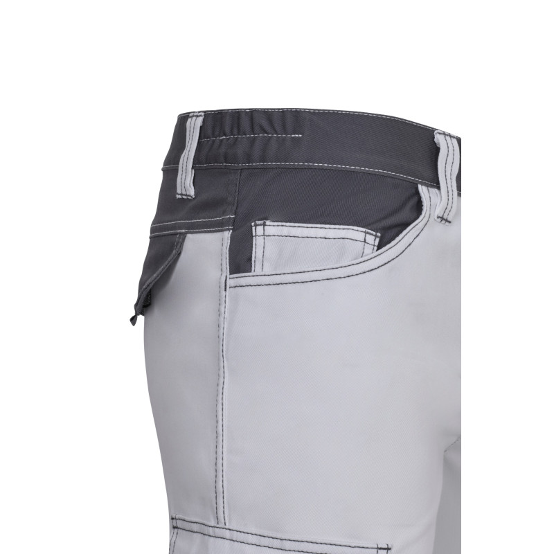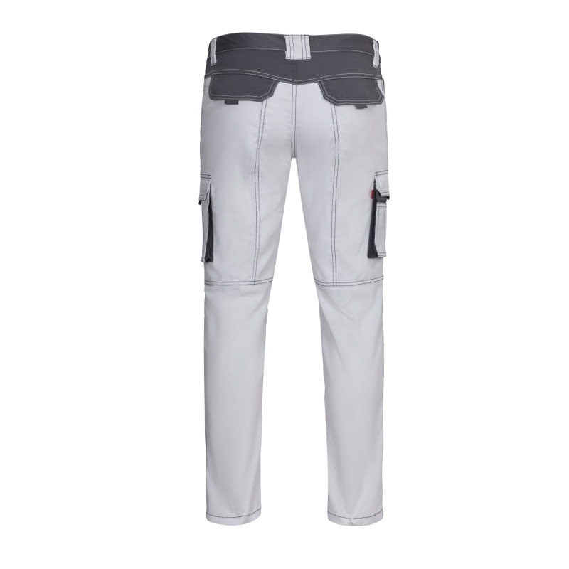 Corte slim fit Cierre central con cremallera y botón Costuras con hilo de contraste Cinturilla elástica Doble costura de seguridad Seis bolsillos: 2 bolsillos franceses 2 bolsillos de fuelle con doble fuelle central, tapeta, velcro y tiradores 2 bolsillos traseros de parche, con tapeta, velcro y tiradores Composición STRETCH. 46% ALGODÓN - 38% EME 240 GSM