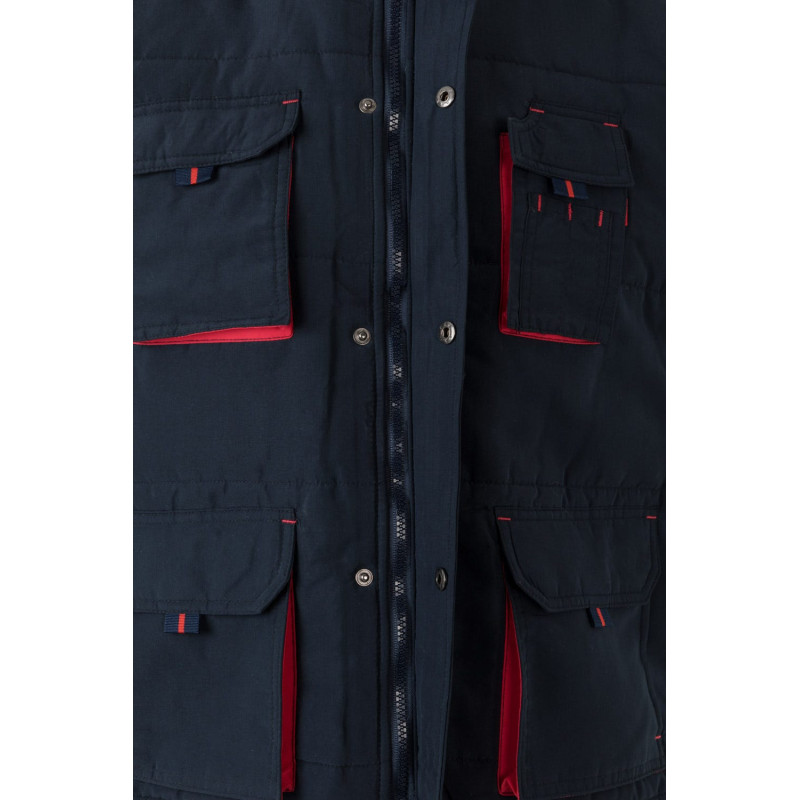 Siete bolsillos: 1 bolsillo de fuelle en el pecho, con tapeta, tirador y velcro 2 bolsillos inferiores de fuelle, con tapeta, tirador y velcro. Debajo de cada uno, 2 bolsillos laterales 1 bolsillo de fuelle en el pecho, con tapeta, tirador y velcro. Sobre él, compartimentos para bolígrafos 1 bolsillo interior de parche