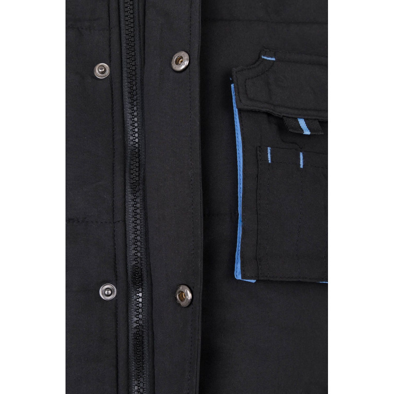 Siete bolsillos: 1 bolsillo de fuelle en el pecho, con tapeta, tirador y velcro 2 bolsillos inferiores de fuelle, con tapeta, tirador y velcro. Debajo de cada uno, 2 bolsillos laterales 1 bolsillo de fuelle en el pecho, con tapeta, tirador y velcro. Sobre él, compartimentos para bolígrafos 1 bolsillo interior de parche